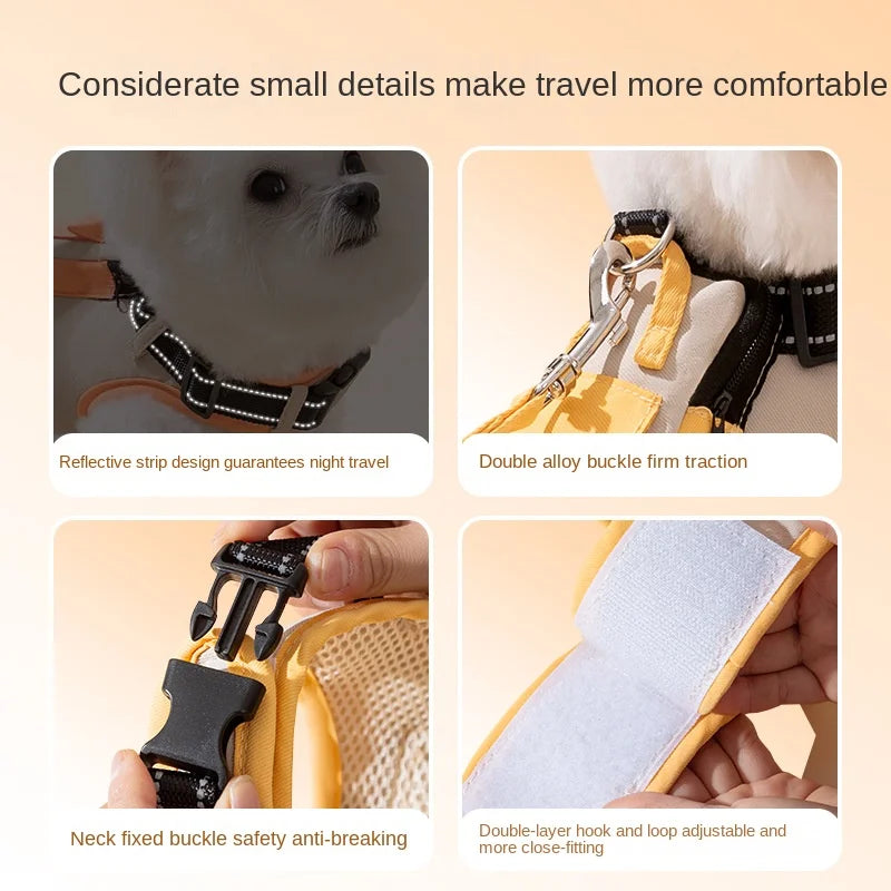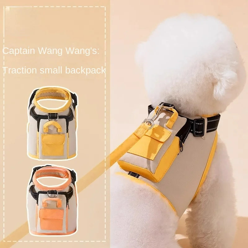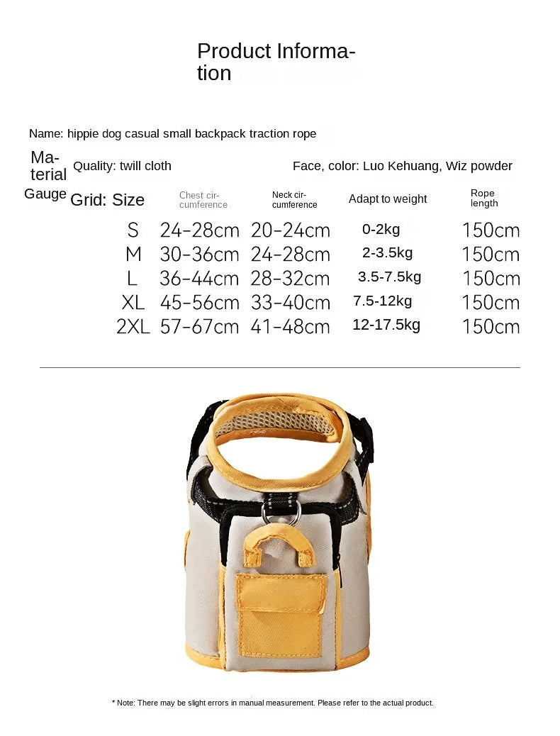 This Dog Harness Backpack is designed for comfort and practicality. Made from breathable polyester blends, it features adjustable straps for a secure fit and is suitable for dogs of various sizes, from S (0-4 pounds) to XXL (24-35 pounds). The harness comes with a handy pocket, perfect for storing treats or small essentials, ensuring your dog is ready for any outdoor journey. Don't wait—get your furry friend the comfort they deserve!