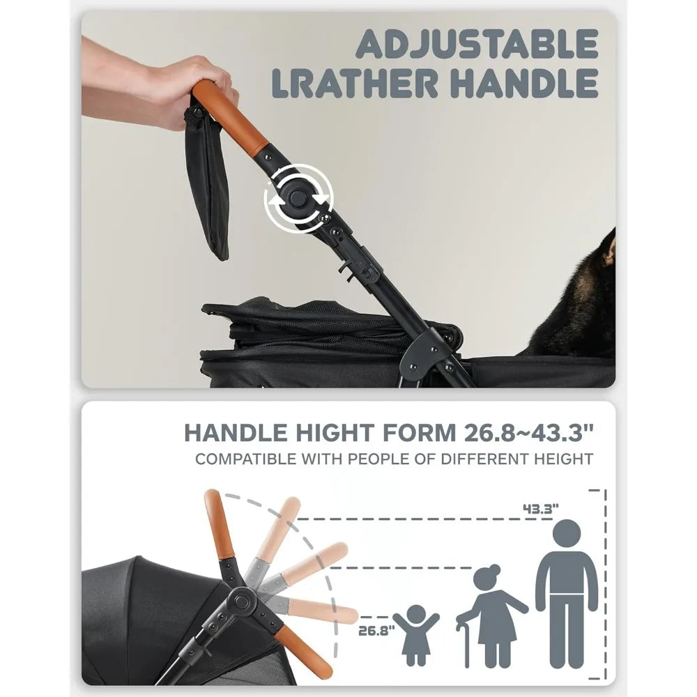 - Height-Adjustable Handle: The handles of the Zoosky folding dog stroller can be adjusted to accommodate users of different heights. Whether you're a child, an elderly person, or an adult, you can comfortably push the stroller thanks to the adjustable handle, which ranges from 26.8'' to 43.3'' in height.
